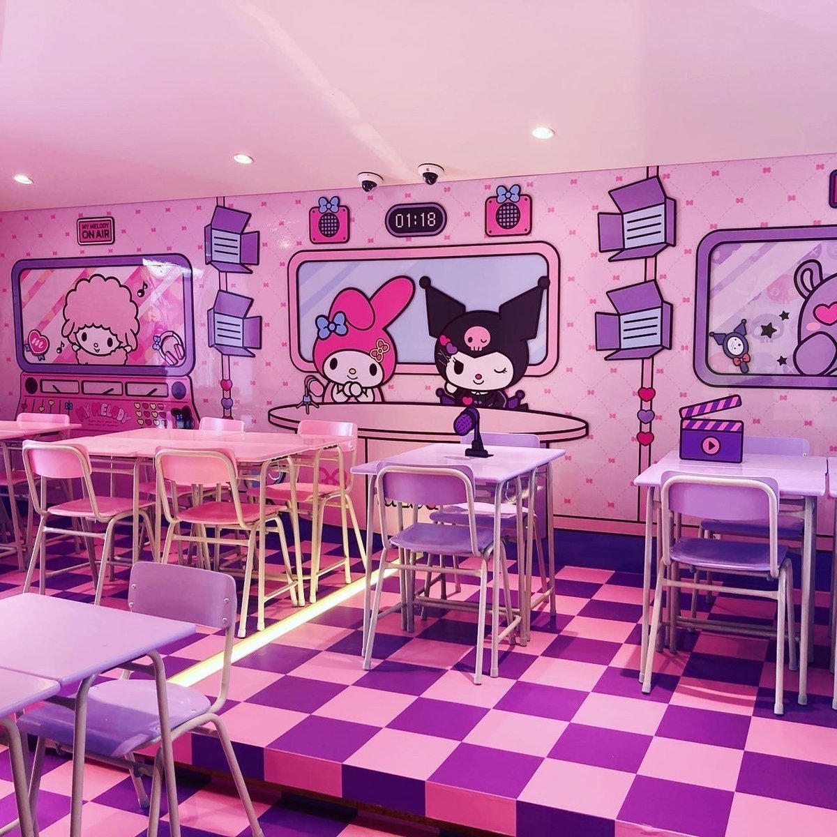 教室のような雰囲気で、机にはサンリオキャラクターのグッズが置かれています。壁には放送室がデザインされており、「マイメロディ」と「クロミ」が番組を放送中です。
