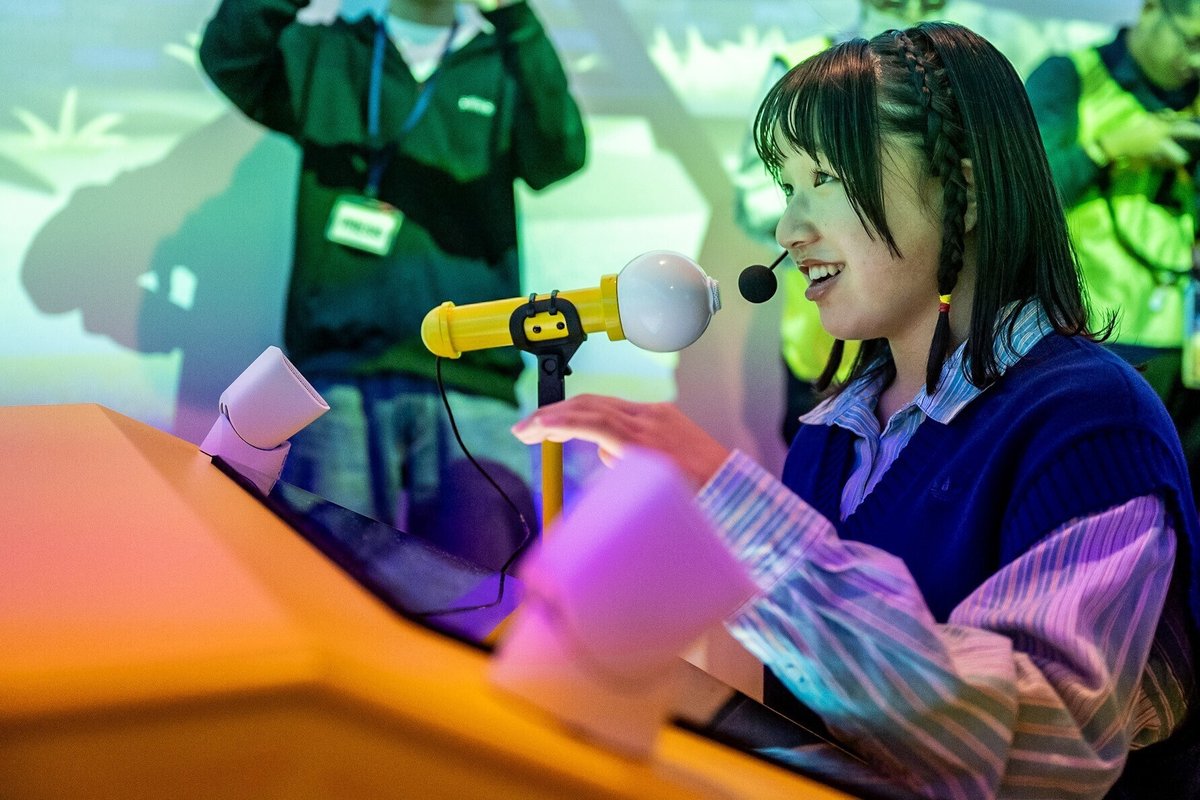 プロジェクションと音声認識機能を組み合わせた空間で、自分の話した英語のアイテムが映像で飛び出します。
