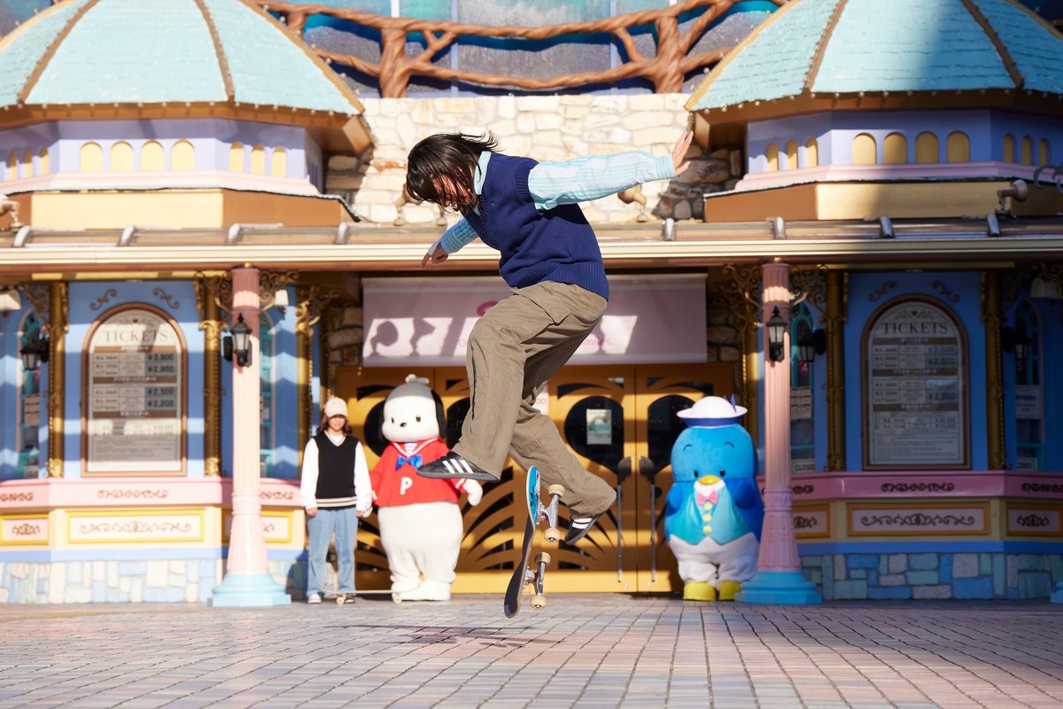 普段はスケートボードが禁止されているのですが、今回は特別にサンリオピューロランドを背景に滑走を披露してくださいました。