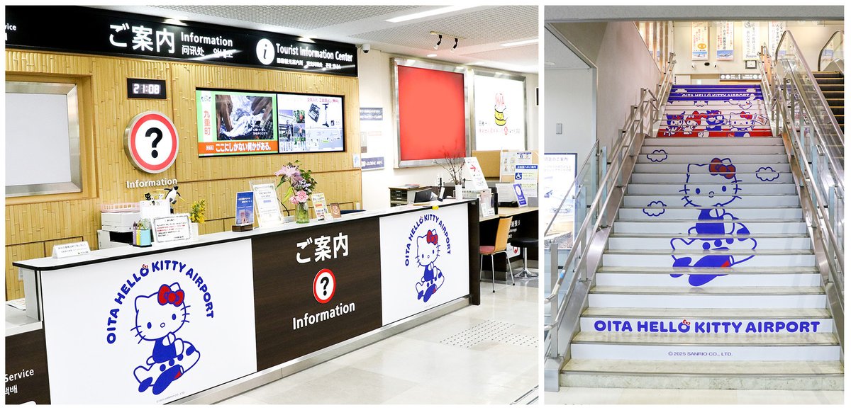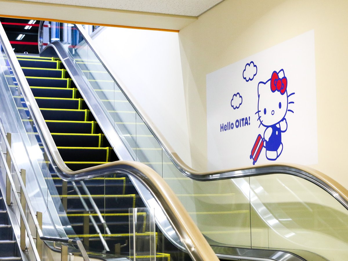 到着エスカレーターでは、「Hello OITA!」のメッセージとともに、「ハローキティ」が元気にお出迎え。