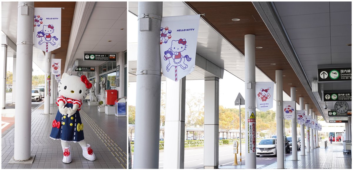 国内線ビルの玄関には、「ハローキティ」のデザインが入ったフラッグも掲げられています。特別に「ハローキティ」が案内してくれました♪