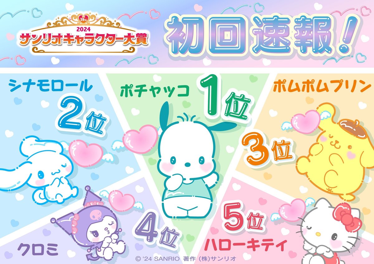 初回速報では、今年でデビュー35周年を迎えた「ポチャッコ」が1位になりました。「ポチャッコ」は昨年の4位から急上昇し、初めての速報1位です。
