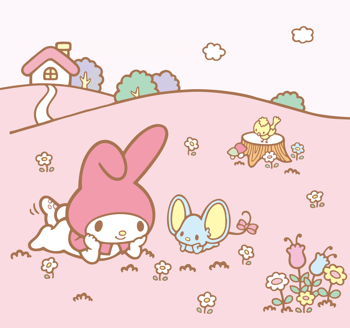 色々な森があり、その中にそれぞれの町があります。「マイメロディ」は、そんな“マリーランド”の“うさぎのいる丘”に暮らしていて、おうちの近くのお花畑で過ごすのが好きです。