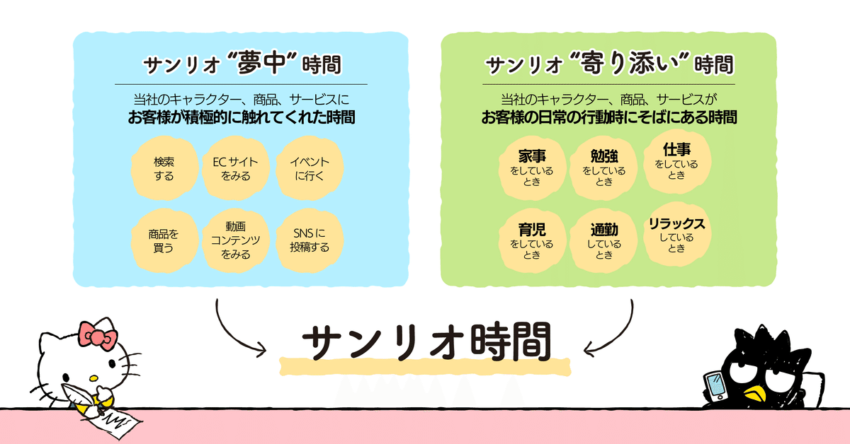 サンリオの企業理念「みんななかよく」の実現に向け、「One World, Connecting Smiles.」を胸に事業活動を通して笑顔を生み出した時間を「サンリオ時間」と称し、2021年より10年間で全世界で累計3,000億時間以上になることを目指しています。サンリオ時間は、商品・サービスに、お客さまが積極的に触れた“夢中”時間、そしてお客さまの日常の行動時にそばにある“寄り添い”時間をあわせた時間です。